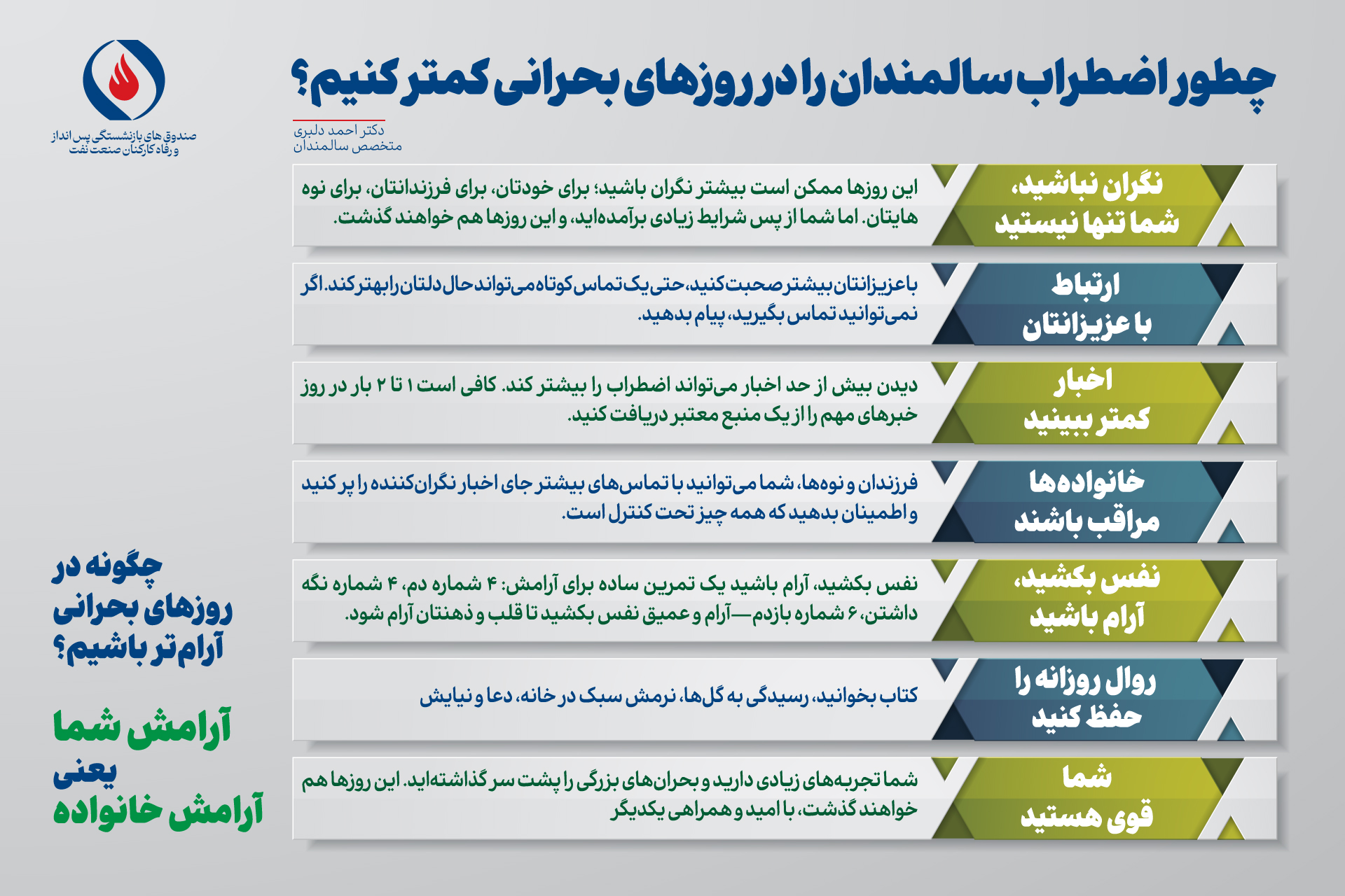 کد خبر: 10207 دریافت تصویر چطور اضطراب سالمندان را در روزهای بحرانی کمتر کنیم؟ اخبار مرتبط راهکارهای مدیریت استرس برای افرادی که در مواجهه با موج انفجار دچار ترس و نگرانی شدند رکورد پرداخت علیالحساب مستمری شکسته شد / افزایش یک هزار و صد میلیارد تومانی برای پرداخت علیالحساب ۱۴۰۴ راهنمای رفتار مسئولانه خانوادهها در روزهای تنش ورزش، راهکاری مؤثر برای کاهش اضطراب در شرایط بحرانی مدیریت آرامش و هوشیاری در شرایط جنگی